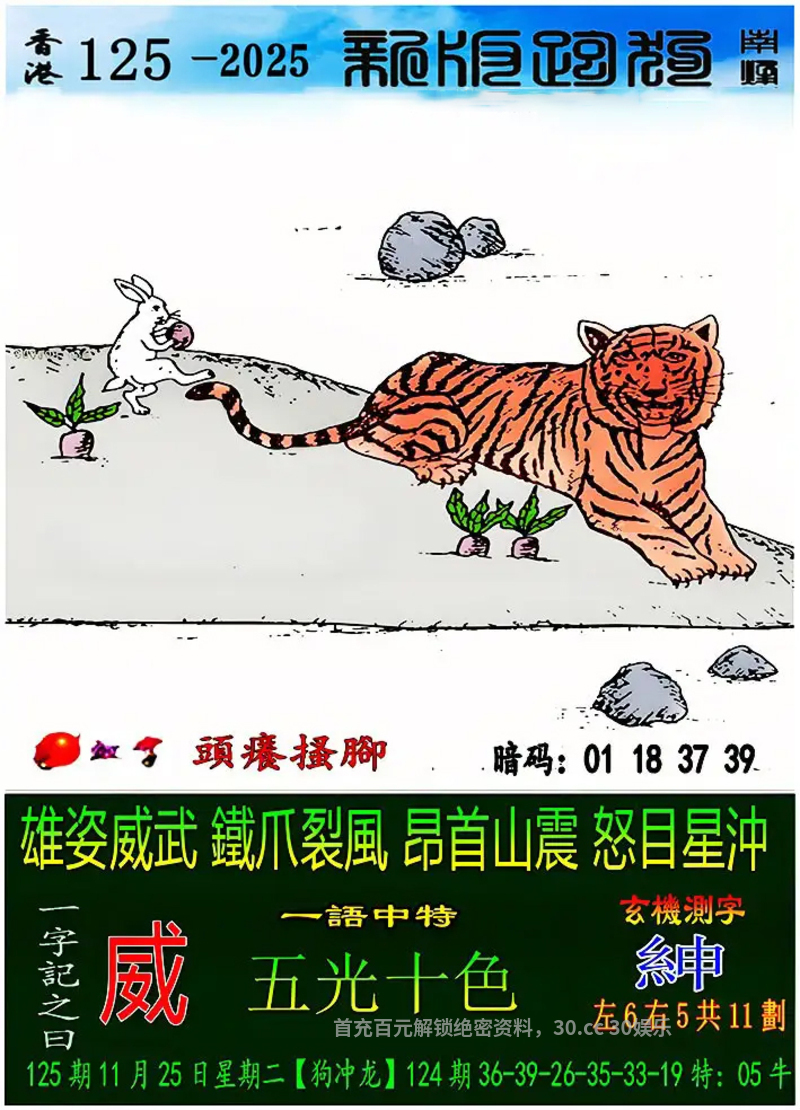 125期一字記之曰:【威】雄姿威武,鐵爪裂風,昂首山震,怒目星沖《紳》